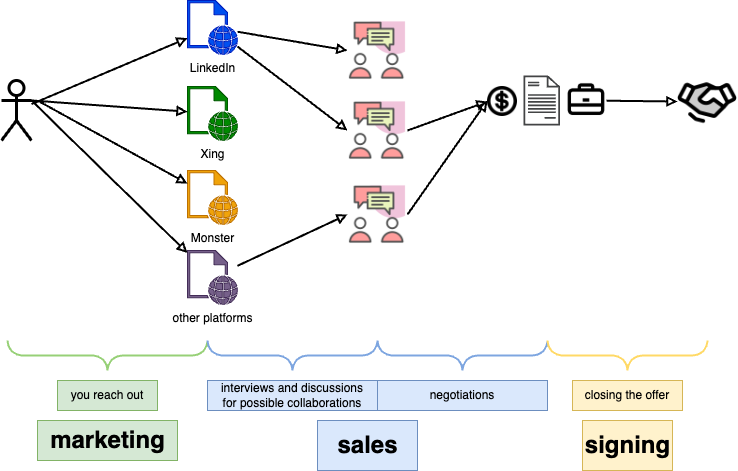 Marketing involves promoting yourself and getting the word out that you’re open to new collaborations. It’s finding leads. In the sales part, you have a few parties interested in your services, and you’re evaluating closer up, to determine if there’s a match. You’re having calls and discussions with people from those companies.